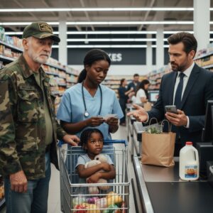 I stood in that checkout line, an invisible seventy-four-year-old man, watching a mother in scrubs tremble as a stranger in a tailored suit barked, “Get a job!” right in her face. He didn’t see the exhaustion carved under her eyes or the little girl clutching a gallon of milk like a lifeline. He just saw an inconvenience. But when that milk jug hit the floor with a thud that cracked the air open, something woke up inside me that hadn’t moved since 1968. I wasn’t going to let this slide. What happened next silenced the entire store.