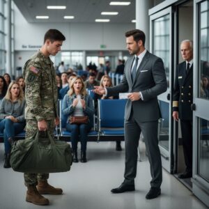I was shaking. Not from fear, but from pure exhaustion after a 9-month deployment. When they called for active duty military to board, I stood up. That’s when a businessman pushed past me, waving his Platinum status like a weapon. “Soldiers wait in the back,” he sneered. “I pay the bills around here.” I felt small. I felt invisible. Until a voice like thunder cut through the noise: “Sir, step back.” You won’t believe what the Pilot did next.