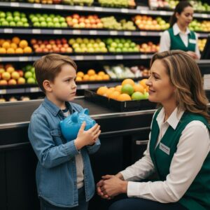 The Boy With the Blue Piggy Bank: I was just restocking apples when I saw him—a trembling eight-year-old counting crumpled singles to save his sick grandmother. He was fourteen dollars short and refusing charity, standing tall with a pride that broke my heart. What he proposed next wasn’t just a deal; it was a lesson in dignity that silenced the entire checkout line and changed my life forever. You won’t believe the riddle he asked me.