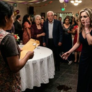 Me invitaron a su fiesta de lujo solo para burlarse de mi ropa humilde, pero cuando puse ese sobre amarillo sobre la mesa, a la anfitriona se le cayó la copa de la mano y se le borró la risa para siempre.