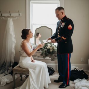 Ten years ago, a folded flag was handed to my mom. Today, I looked at the empty chair in the front row and felt like I couldn’t breathe. I hid in the bridal suite, ruining my makeup, until a stranger in a Marine uniform knocked on the door. He said he made a promise to my dad before their last patrol. He handed me a letter that had been sealed for a decade. The words my father wrote from a bunker in Afghanistan gave me the strength to do the impossible.