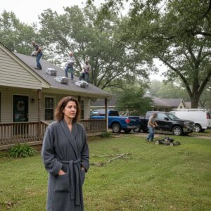 I didn’t hire anyone. I couldn’t afford to. Yet, the morning after the storm destroyed my roof, five trucks pulled up to my curb. Men were climbing ladders and firing up lawnmowers before I even had my coffee. I panicked, thinking it was a mistake or a scam. I rushed outside to stop them, my heart pounding. That’s when a man covered in dust climbed down, looked me in the eye, and told me a secret my late husband had kept from me for years—a promise made in the desert that saved my life today.
