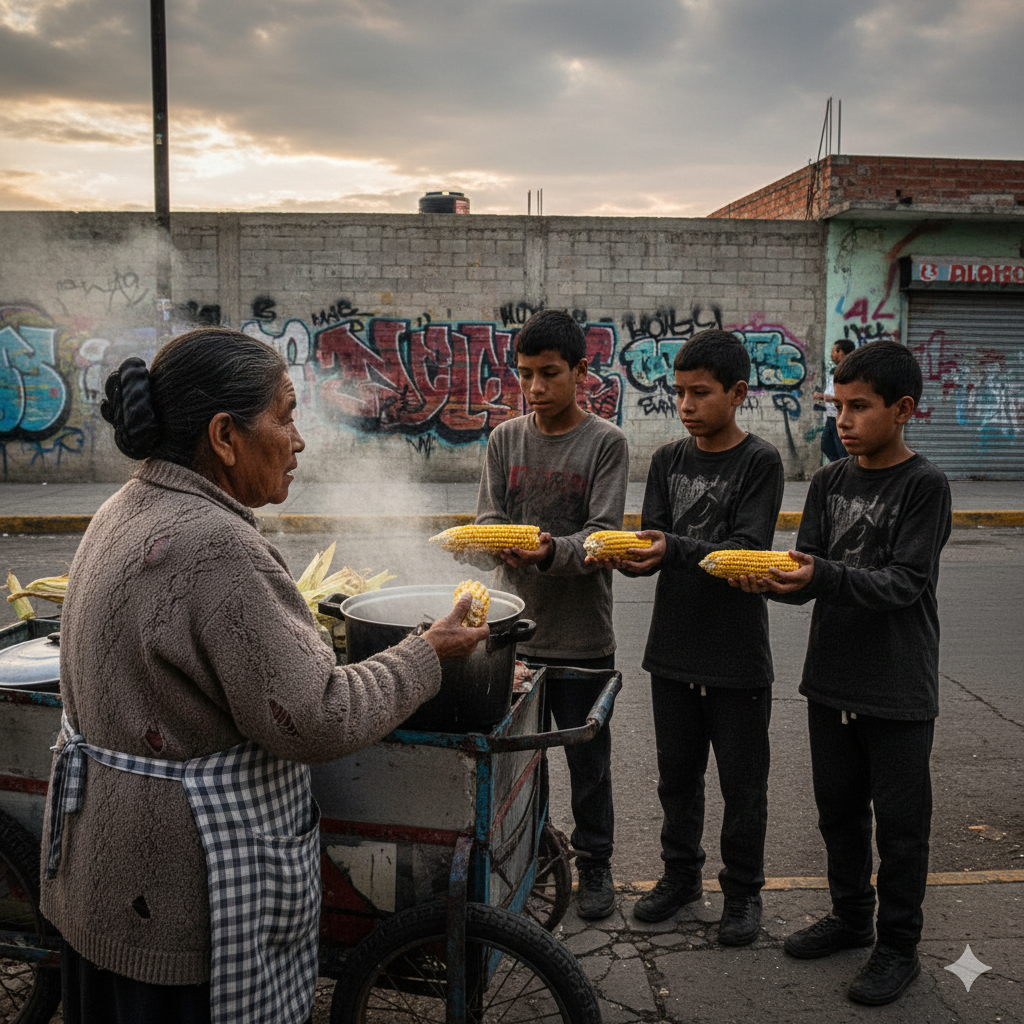 Se miraron entre ellos. El del medio, un muchachito de ojos valientes, asintió apenas. “Sí”, respondió con un hilo de voz. Les entregué un elote caliente a cada uno. El vapor subió entre nosotros como una oración. Se quedaron mirando la comida como si fuera a desaparecer, como si fuera un sueño del que no querían despertar.