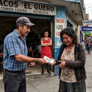Mi mesera humilló a esta mujer hambrienta en la puerta de mi fonda. La defendí y le di mis últimos 500 pesos. Cinco años después, lo perdí todo y terminé recogiendo basura en la calle para sobrevivir. Pero un día, un auto de lujo se detuvo frente a mí. Lo que pasó después te dejará sin aliento.