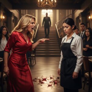 Rompió su copa de vino y rasgó mi uniforme pensando que era una simple “gata”, sin saber que la dueña millonaria estaba frente a ella y su esposo lo grababa todo.