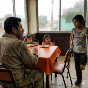 Me quedé helado un segundo, no por duda, sino por el impacto. ¿Cuántas veces había pasado yo de largo ante el dolor ajeno? Pero esta vez, el dolor tenía el rostro de una niña de doce años. Mis hijos, Isla y Grady (o como yo les digo de cariño, Sofi y Lalo, mis chamacos), dejaron de jugar con los sobres de azúcar. Ellos, en su inocencia, no veían la discapacidad ni la ropa gastada; veían a una niña, igual que ellos, parada ahí esperando una respuesta.