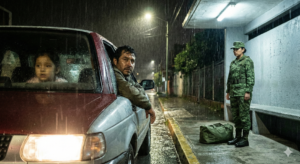 Entorné los ojos. Bajo la luz parpadeante de la parada del camión, había una figura solitaria. Llevaba el uniforme empapado y una maleta a sus pies. No se movía. Estaba ahí parada como si el mundo se hubiera detenido solo para ella, con una postura rígida que gritaba un cansancio más allá de lo físico.