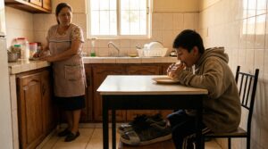 Mientras hacían la tarea en la mesa de la cocina, noté otro detalle que me dolió: Iván no traía mochila. Sacó sus cuadernos de una bolsa de plástico arrugada, de esas del súper. Su hoja estaba llena de borrones, grises de tanto intentar corregir. No era flojera, se notaba que era pura lucha por hacerlo bien.
