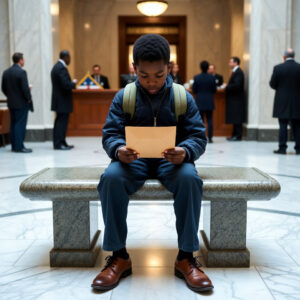 “I wanted to do it myself,” I continued, feeling the need to explain my failure. I looked down at my feet. “I polished my shoes, Uncle Lawrence. I tried to look nice. But the man up there at the big desk…” I pointed a small, trembling finger toward the glass-walled offices at the front of the lobby. “The man with the shiny nametag. He didn’t want to look at the papers.”