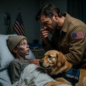 Titan knew before I even looked at the machine. Titan lifted his head. He stood up slowly, the blue hospital gown rustling slightly in the quiet. He didn’t nudge the boy or lick his face. He instinctively understood that the fragile spirit he had been guarding was no longer tethered to that broken body. For a long moment he simply stared at the still child. His amber eyes were wide, taking in the profound absence of life.