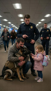 Titan wasn’t just a German Shepherd; he was a massive, 95-pound retired Marine K-9, a hero who had taken shrapnel in Fallujah to save lives. But right now, in this crowded airport terminal, he was just a terrified, grieving ghost. My younger brother, Matt—Titan’s handler—had just passed away. We were supposed to be flying to his funeral. Instead, the loud clang of a dropped janitor’s bucket had triggered Titan’s PTSD, and the whole airport looked at my brother’s best friend like he was a loaded w*apon.