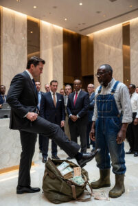 In that agonizingly stretched second, I didn’t look at the bag. I looked at him. I looked at the man who had just assaulted my property. A Senior Advisor. Mr. Vance. He stood there, wrapped in a $5,000 custom suit that draped perfectly over his narrow shoulders, a suit bought with percentages and phantom numbers, not sweat or calluses. His chest was puffed out, a peacock in a glass cage. The arrogant smirk that twisted his face was a portrait of unearned superiority. He had pinched his nose just moments prior, looking at my dark skin and my muddy boots with an absolute, unfiltered disgust. To him, I wasn’t a man. I was a stain. I was an error in his pristine, multi-million dollar algorithm. He had told me to take my dirt and pennies to a public bank. He had sneered that I smelled like a barn and that the minimum deposit was $10 Million. He had commanded me to get out before he called security, accusing me of tracking mud onto his Italian marble.