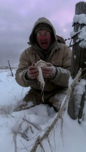 I didn’t speak. I stood with my feet planted shoulder-width apart in the deep snow, my right hand gripping the handle of my pocket knife so tightly my knuckles were white. The blade was held low, partially hidden against my leg. My entire body was shivering violently, uncontrollably, the thin denim jacket offering absolutely no protection against the howling vortex.