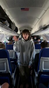 As he walks past the passengers, now cheering his name, he looks like just a kid again.