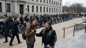 “That’s when a woman in a sharp suit pushed through the bikers,” I thought, recognizing the shift in the room’s energy.