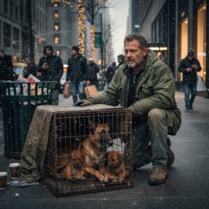 People walked past. A woman in a designer coat frowned as if annoyed by the inconvenience of seeing suffering before breakfast. A man stepped over the edge of the cage without breaking his phone call. Someone’s shoe clipped the wire mesh, hard enough to jolt it, and the dog flinched violently, squeezing her eyes shut as if bracing for a k*ck that never came.