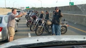 The crowd of stranded drivers was growing bolder. A few more had stepped out of their vehicles, forming an angry mob just a few yards from our bikes. A woman in a luxury SUV was screaming that she was going to call the governor. A truck driver was revving his massive engine, trying to intimidate us into moving.